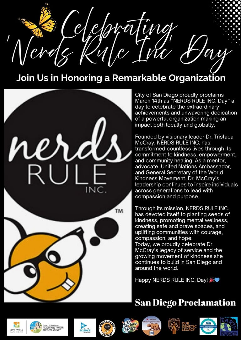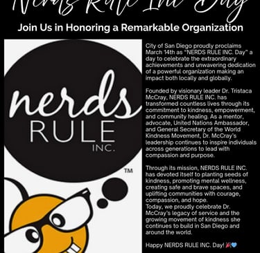 The City of San Diego has proudly proclaimed March 14th as "NERDS RULE INC. Day," honoring the incredible impact this organization has made on our youth and our future.